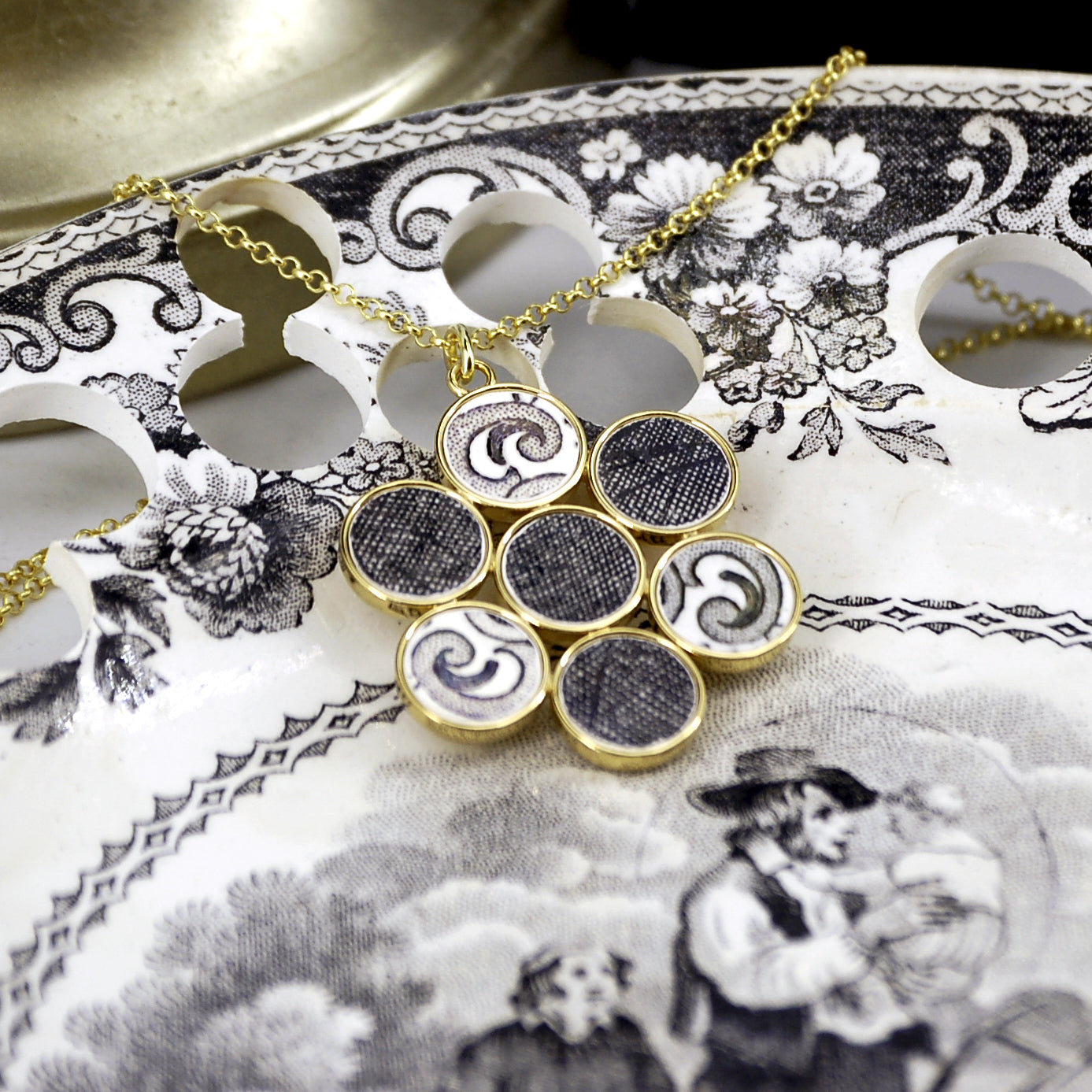 Conçu et fabriqué par Clélia, l'artisan d'art de l'atelier Vézanne, ce bijou révèle tout le charme et l'élégance de cette "chinoiserie" issue d'un plat ancien fendu en faïence du 19ème siècle.