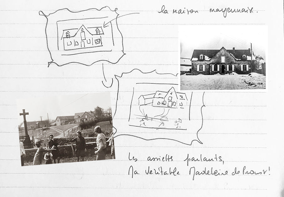 Les services de famille ont marqué mon enfance. Sortis les jours de fête ou les dimanches, ils incarnaient les retrouvailles autour des plats savoureux préparés par mes grands-mères. Ces instants, leurs odeurs et leurs saveurs sont gravés dans ma mémoire d’enfant. Et les décors… surtout ceux des assiettes parlantes, m’ont profondément touchée : leur élégance, leur finesse, leurs couleurs et l’humour qu’ils révélaient.