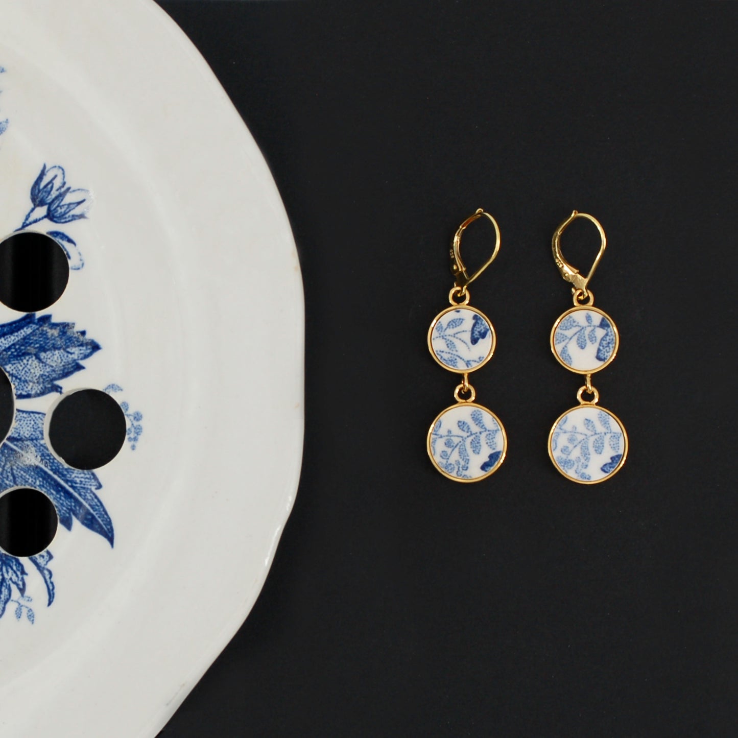Fabriqué à partir d'une assiette ancienne ébréchée, ce pendentif fait ressortir un décor à la fois authentique et raffiné.
