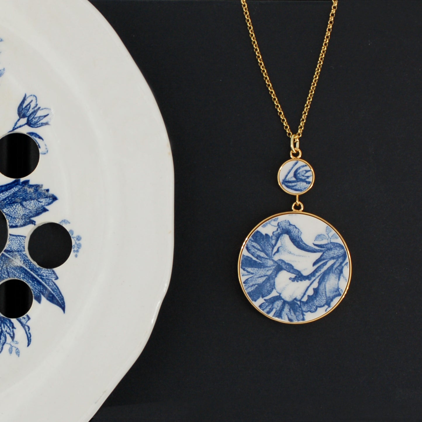 Des fragments de faïences extraits d'une assiette ancienne pour devenir une paire de boucles d'oreilles originale.